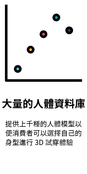 3D尺寸試穿系統,提供精準尺寸,讓各式各樣身材的消費者了解穿上後的差異